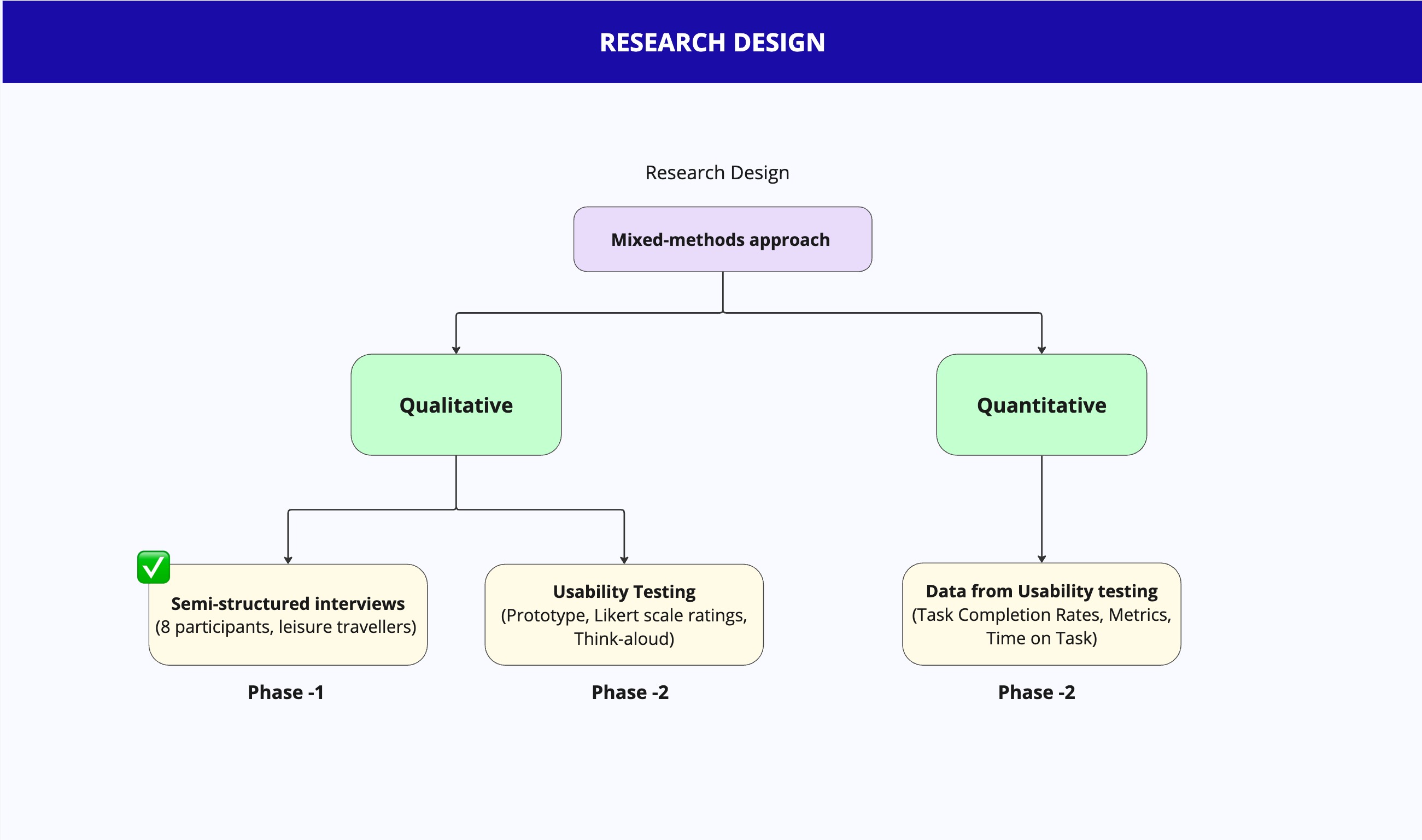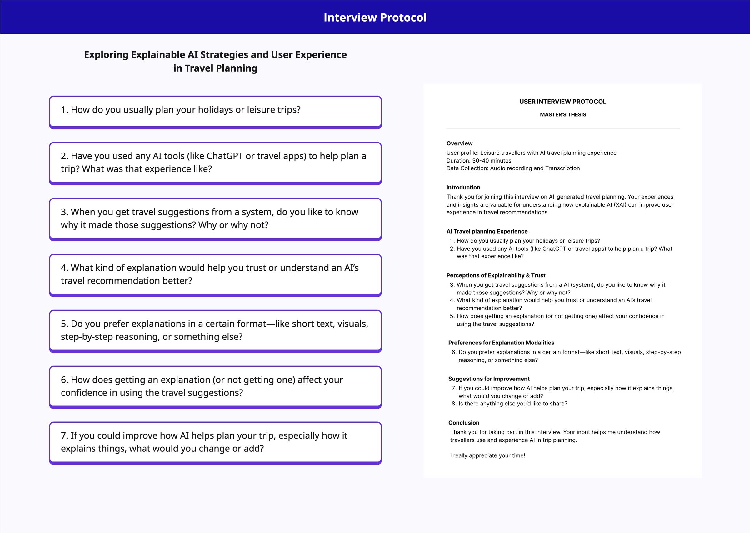 I successfully interviewed 8 participants, carefully selected based on their experience with AI and travel planning. The main goal was to understand how they currently plan trips, their experiences using AI for travel, and their first thoughts on 'Explainable AI' (XAI).