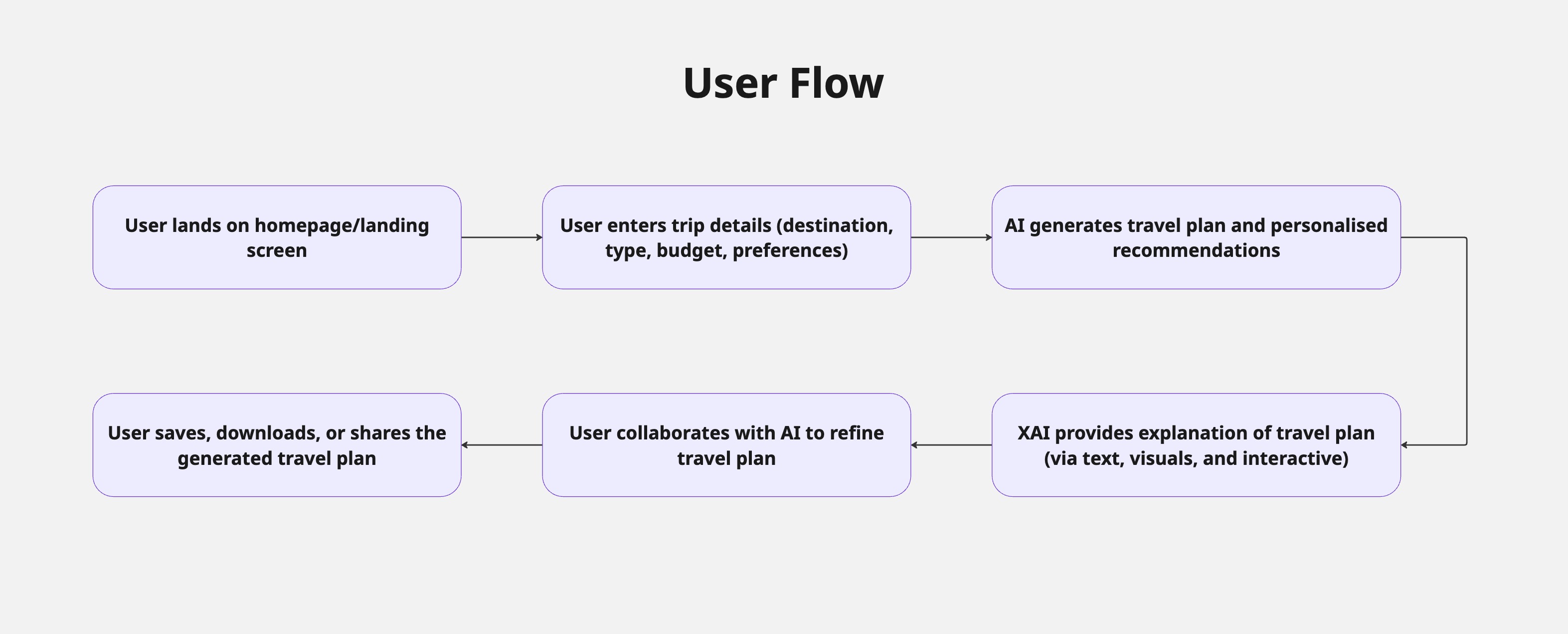 My current focus has been on designing the user flow, mapping how leisure travellers interact with the AI while creating their ideal travel itinerary. This flow highlights key moments where XAI can support decision-making and build user confidence in the recommendations. The completed user flow is attached to this post.